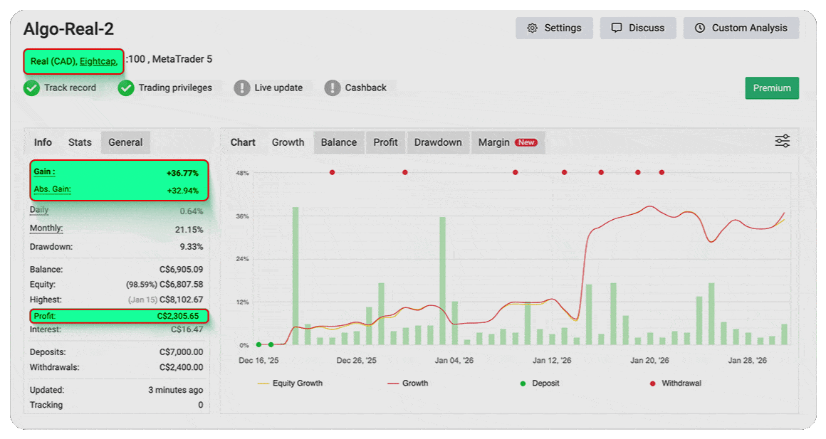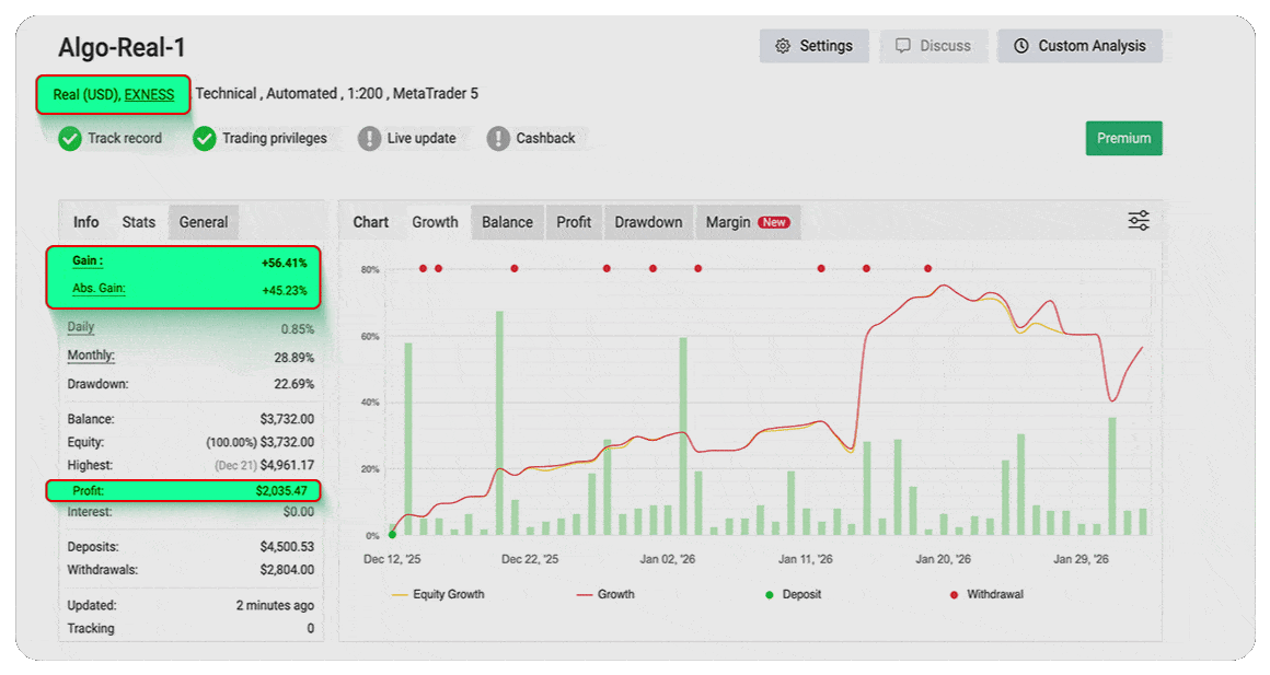Explore our Myfxbook portfolio to see the outstanding performance of our Algo over the last three months. Witness firsthand how our automated trading strategies have consistently outperformed the market.